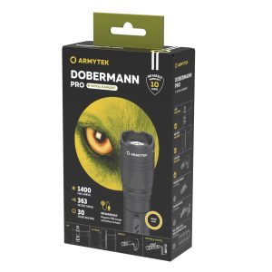 ТАКТИЧЕСКИЙ ФОНАРЬ 2 В 1 С МАГНИТНОЙ ЗАРЯДКОЙ. Dobermann Pro — это модель с узким углом света и плавным переходом между центральным пятном и боковой засветкой. Сочетание компактного корпуса и впечатляющих характеристик светового потока делает Dobermann Pro фонарем 2 в 1 для тактического использования и на каждый день. Фонарь яркостью в 1500 люмен лучше всего подходит для решения задач на средних дистанциях в 100-200 метров (максимальная дистанция света 368 метров). Dobermann Pro можно брать с собой в продолжительные поездки или на природу. Как и все модели обновленной тактической линейки, это готовое высокотехнологичное решение с аккумулятором и магнитным кабелем для зарядки от любого USB источника питания. Стандартный диаметр корпуса в 1 дюйм позволяет использовать фонарь с дополнительными тактическими аксессуарами: любыми подствольными креплениями и оригинальными выносными кнопками. Для удобного ежедневного ношения в комплект входят прочный нейлоновый чехол, стальная клипса и ремешок на руку. Фонарь 2 в 1: 1. Тактический. 2. На каждый день.
