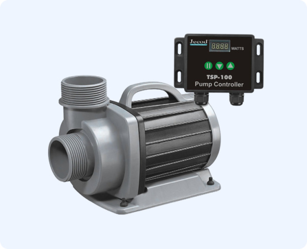 Насос TSP-10000 – насос серии TSP Jebao предназначен для подачи воды на каскад, ручей, фильтрацию и просто циркуляцию Вашего водоема. Данный насос может устанавливаться как в водоеме, так и за пределами его (сухая установка). Особенности данной модели в том, что в комплект входит устройство способное, при вашем участии, повышать или понижать мощность насоса, соответственно и количество подаваемой воды на каскад, ручей и т.д. Очень удобно при эксплуатации. Устанавливается очень просто – ставится насос (либо в водоем, либо рядом с ним), от насоса идет кабель, который подключается к блоку управления мощностью, затем из блока выходит кабель для подключения в розетку.Если глубина водоема 1.3 м и более, то насос можно оставить на глубине в зимний период. Энергосберегающий насос для пруда Jebao TSP оснащенный контроллером с LED дисплеем. Имеет возможность дистанционного включения/выключения, настройки мощности насоса.