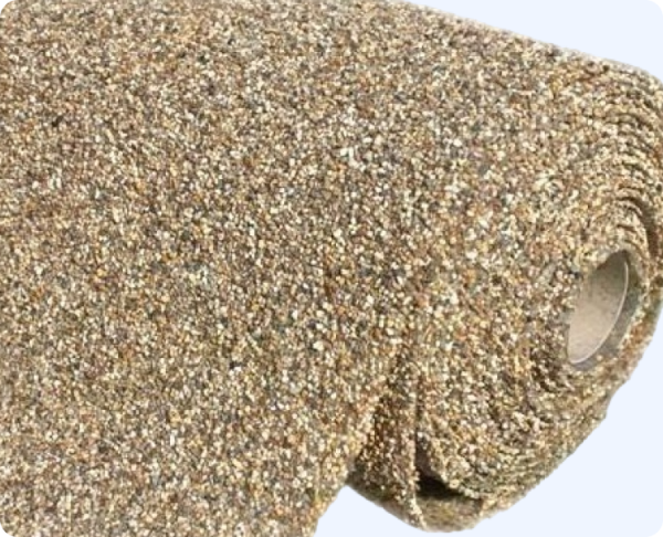 Для декорирования водоема применяется специальная пленка с гравийным покрытием, которая значительно облегчает данный процесс особенно для отвесных берегов. Камешки нанесены с помощью специального клея на геотекстильную поверхность толщиной 0.5 мм., размер камней 2-5 мм.